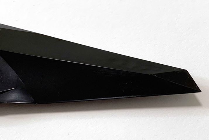 写真ではちょっとわかりにくいですが、刃の部分(写真下側)は、紙が滑りやすいように鏡面仕上げ、刃でない部分(写真上側)は微細加工という手法を使ってあえて筋を出し、黒曜石らしさを表現しています。