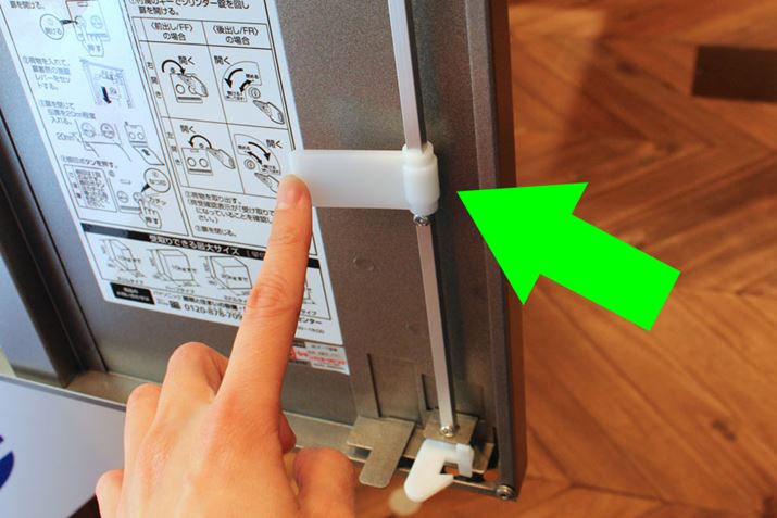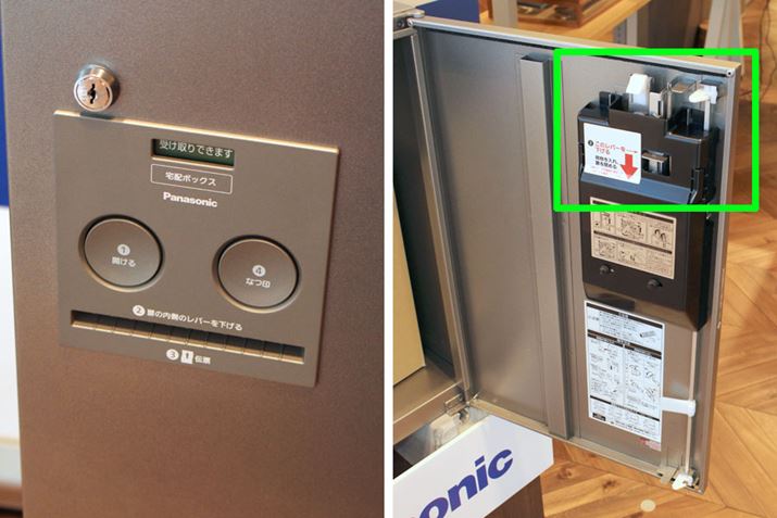 宅配業者は、荷物をボックスに入れてドアを閉めたら、ドアにある差し込み口から伝票を入れ、「なつ印」ボタンを押せば受け取りのハンコが自動で押されます(写真左)。AiSEGはドア内側の上部、緑枠の部分に取り付けることができます(写真右)。ただし、AiSEG自体には電源が必要
