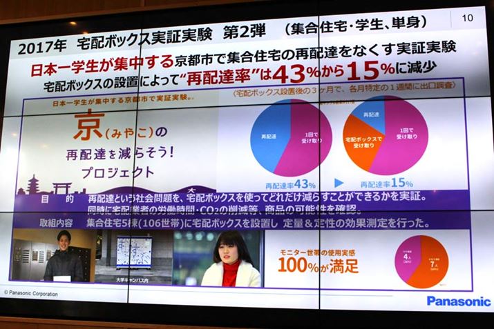 「共働き率日本一」というデータが出ている福井県(あわら市)での実験では、なんと同社製宅配ボックスの設置によって同市内の再配達率が49%から8%に減少したそう。また、日本一学生が集中するという京都市では、宅配ボックスの設置によって集合住宅における再配達率が43%から15%に減ったそうです。いずれも大きな数字ですよね。