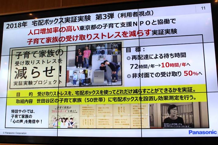 同社は現在、実証実験の第3弾として、人口増加率の高い東京都・世田谷区にて「子育て家族」を対象としたプロジェクトを実施中です(2018年12月〜2019年1月)。小さい子どもがいる家庭に宅配ボックスを設置することで、宅配便の受け取りストレスを減らすというものです。