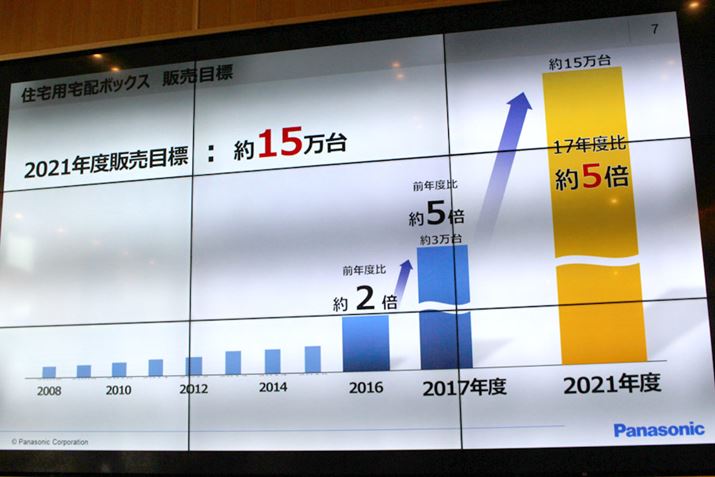 パナソニックの住宅向け宅配ボックスの売上は、やはりネット通販が一般に浸透した2016年から一気に右肩上がり。その時点でも前年比約2倍ですが、2017年度はさらにそこから同約5倍に。同社では、2021年度までに約15万台の売り上げ規模を目標に掲げています