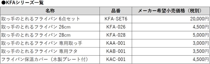 ラインアップは、2サイズのフライパン、取っ手、フタ、保温カバー(木製プレート付き)が同梱された「サーモス 取っ手のとれるフライパン6点セット KFA-SET6」のほか、それぞれを単品で発売