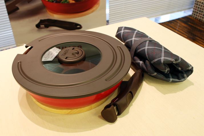 水筒や弁当箱など家の外で使うアイテムを数多く発売しているサーモスですが、家の中で使う製品は少なかったことから、暮らし全体をサポートできるようにキッチンツールを展開する「KITCHEN+(キッチンプラス)」という新シリーズを立ち上げ。そのシリーズ第1弾となるのが、2019年2月1日に発売予定の「サーモス 取っ手のとれるフライパン(KFAシリーズ)」です。内径26cm(KFA-026)と28cm(KFA-028)の2サイズが用意されたフライパンは、摩耗しにくく焦げ付きにくいコーディングが施され、一般的なフライパンよりも10mmほど厚い深型設計とされました。フライパンに取っ手を付ける、外すという仕組みはティファールと同じですが、着脱の機構や素材にこだわり、使いやすさと使用時の安定感がいいのがポイントなのだそう(詳しくは後述)。さらに、調理後のフライパンにかぶせると保温できるカバーもラインアップ。料理を作って家族が揃うまでの時間、保温カバーで温かさをキープしておけば温め直しの手間も減らせるというわけです。フライパンはIH、ガス火どちらにも対応し、食器洗い乾燥機での洗浄も可能。オーブンに入れて加熱もできるので、焼く、煮る、炊くなどいろいろな料理が楽しめます。