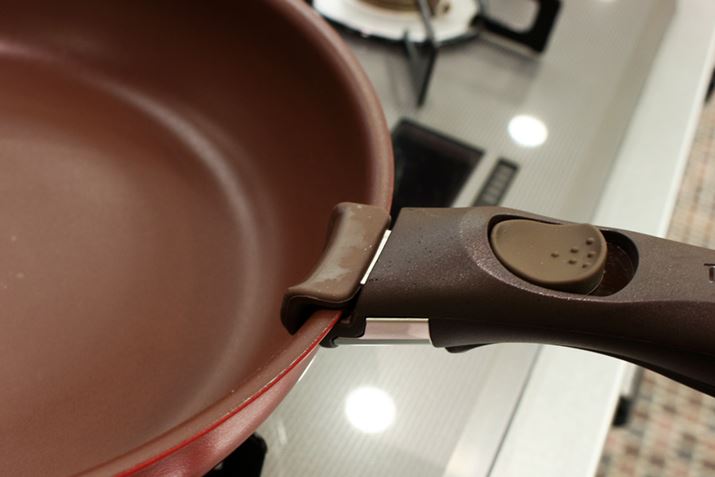 取っ手の取り付けは、上部のボタンをスライドさせてフライパンを挟んだ後、下部にあるレバーを握るだけです。装着した状態でボタンをスライドしても落下しない設計になっているので安心(下の動画参照)。なお、ティファールの取っ手は、サイドにロック機構があります