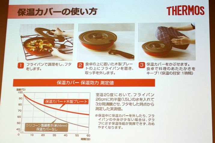 厚みのあるプレートと断熱構造のカバーを使うと、沸騰させたお湯が1時間後も約65℃をキープ。通常の状態では、45℃くらいに冷めてしまうので、保温効果があるのは確かです
