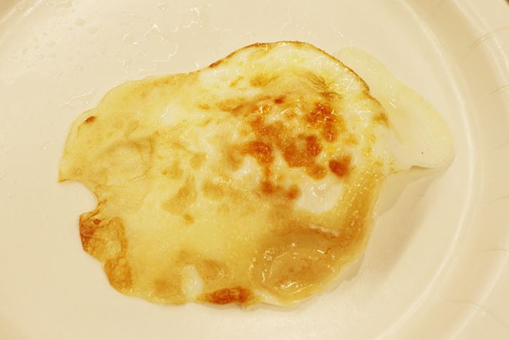 焦げ面はこのような感じ。目玉焼きは、広がった白身がパリパリに焦げてしまうことがありますが、「サーモス 取っ手のとれるフライパン(KFAシリーズ)」で焼いた目玉焼きは端が焦げることもなく、比較的均等に焼けている印象です