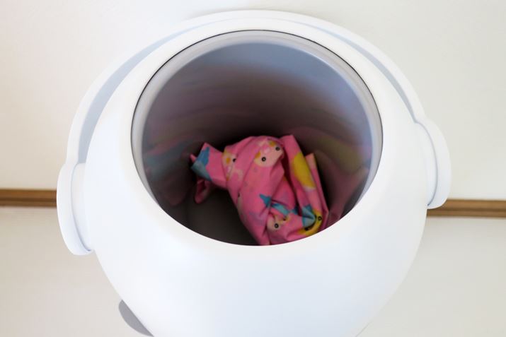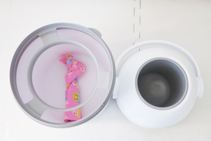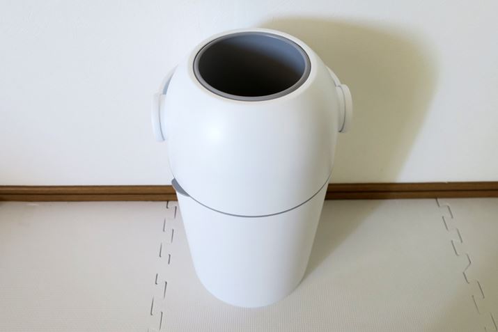 正直、カートリッジ代は痛いのですが、ニオイ対策は花マルをあげられるレベルです。ゴミ捨ての際に時々ニオイがすることもありますが、基本的にはニオイはしません。紙おむつをひとつずつ密封することがニオイ低減には欠かせないと思っていたのですが、今回紹介する「ステール」はカートリッジを使用せず、普通のゴミ袋でニオイを密封するといいます。その秘密は、ゴミ箱の構造にあり! 普通のゴミ箱は投入口からゴミが溜まる部分が見えますが、ステールは投入口の部分がバケツのようになっており、中が見えません。廃棄物を投入口に入れた後、このバケツ状の部分がひっくり返ることでゴミがゴミ箱内に落下し、その後、バケツ状の部分をもとの状態に戻せば、これがゴミ箱のフタになり、ニオイを閉じ込めるという仕組みとなっています。