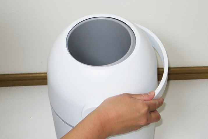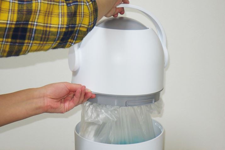 投入口にカートリッジを取り付け(結び目を作って所定の位置にかける必要あり)、使用済みの紙おむつを捨てたら、カートリッジのサイドにあるレバーを1周回します