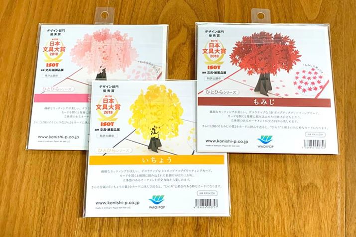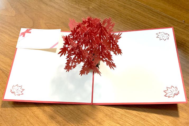 さくら・もみじ・いちょうの3種類があり、さくらには花びらが、もみじ・いちょうには葉っぱが付いています。カードを受け取った方は見事な3Dアートだけでなく、木から散る花びらや葉っぱのたそがれも楽しむことができる逸品です。