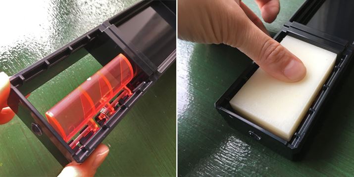 まずこのホルダーにお餅を入れます。ピンク色のものはフラッパーというもので、この上に切り餅をぎゅっと押し込みます