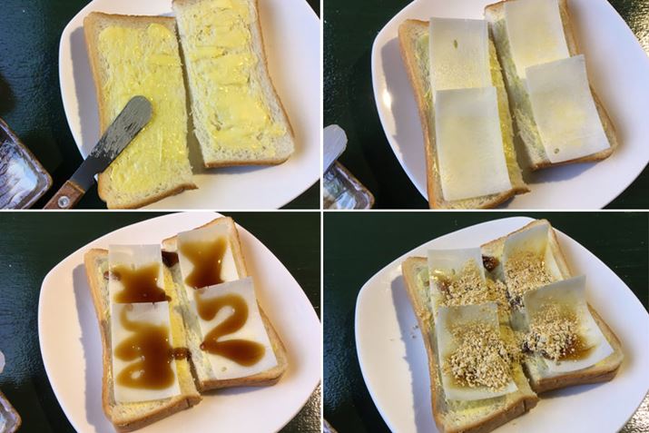 材料は…食パン、バター(マーガリン)、黒蜜、きなこ。これにスライス餅!