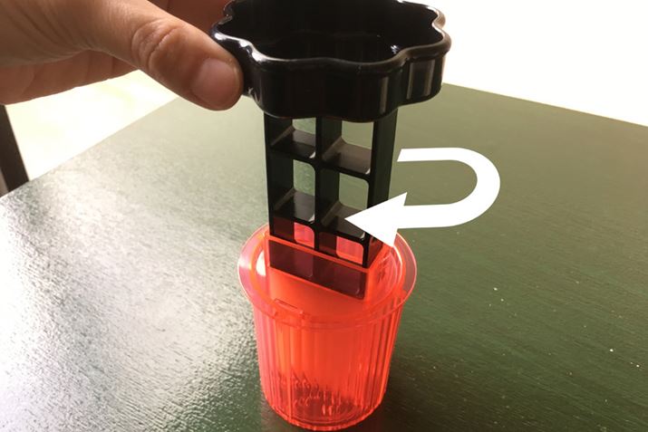 ここからモチスラをテーブルに立てて置きましょう。ではいざ! ホルダーを上下に動かすことでお餅がスライスされます! 上からギュギュっと押し込みますよ。