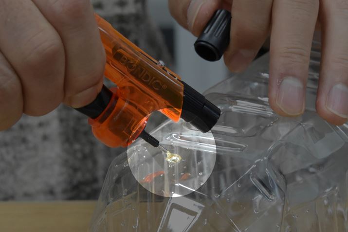 やや粘性のある液体樹脂をペットボトルの側面に出して、同じくペットボトルのプラスチックのキャップを付ける