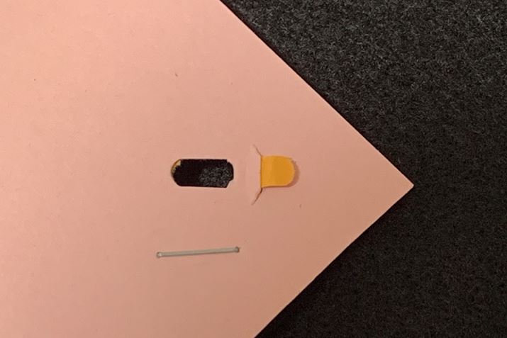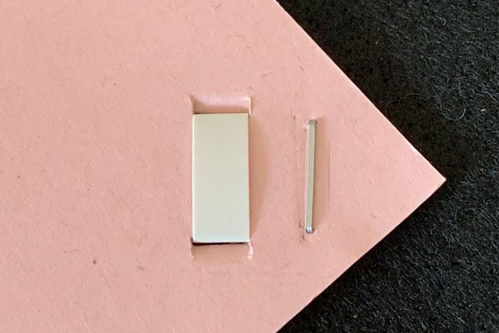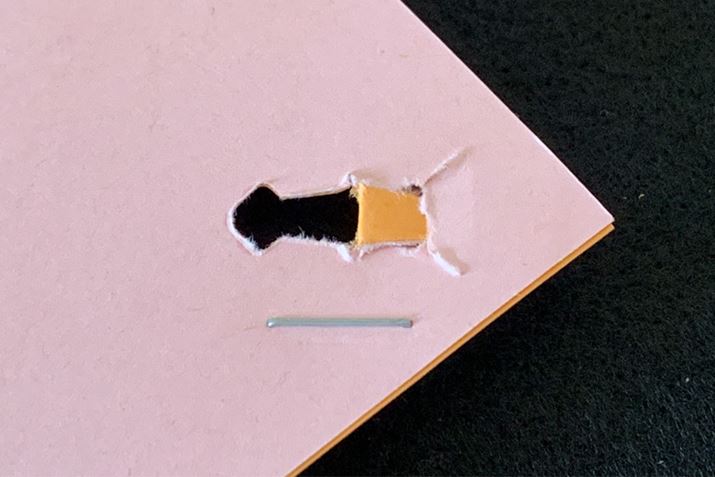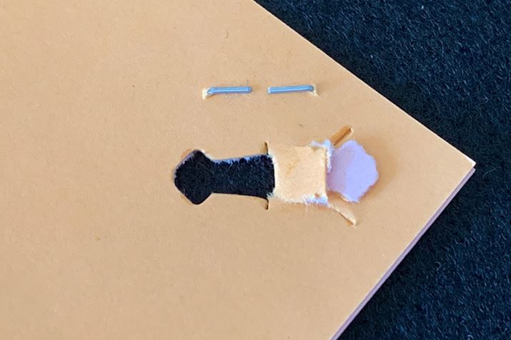 穴はこんな複雑な形状(比較のため通常のホッチキスの針も使っています。以下同様)。ひっくり返すと、矢印状になった部分が織り込まれているのがわかります