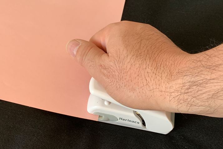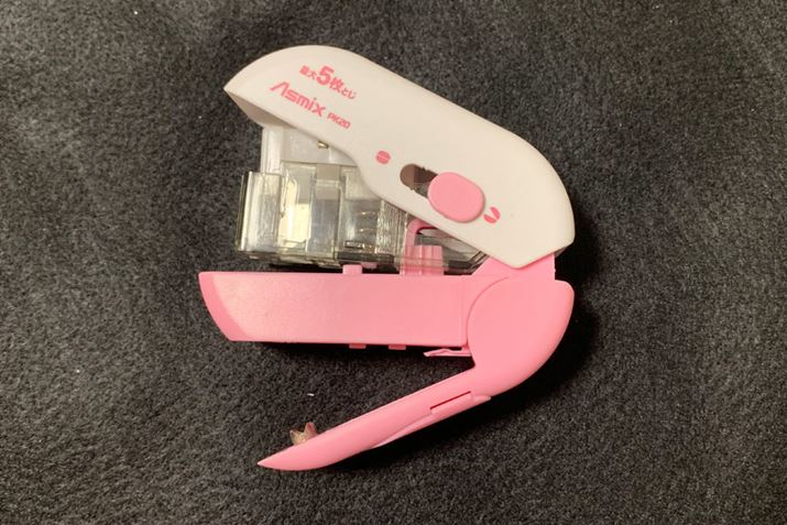 使い方は普通のホッチキスと同じ。写真では力が入っているようにも見えますが(笑)、それほど力は必要ありませんでした