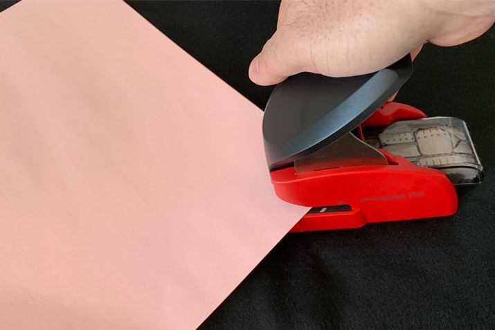 こちらは、プラスの「ペーパークリンチ」。ハンディ型のコンパクト設計で、手の小さな方でも握りやすい大きさです。さらに、軽い力でもとじられるプラス独自の「パワーアシストメカニズム」機構を採用。片手でも軽くとじられるよう工夫されています。針なしホッチキスでは、金属針を使わないためとじ終わりを実感しにくいのですが、「ペーパークリンチ」では、「カチッ」という音で、とじ終わったことがはっきりとわかるように工夫されています。