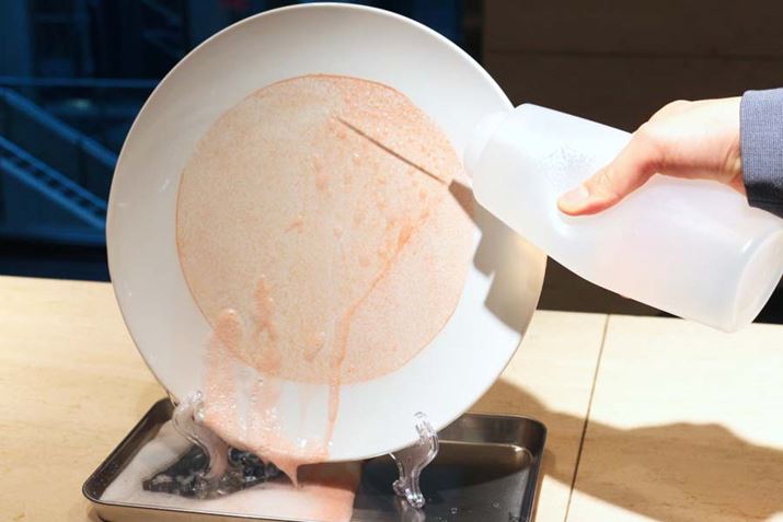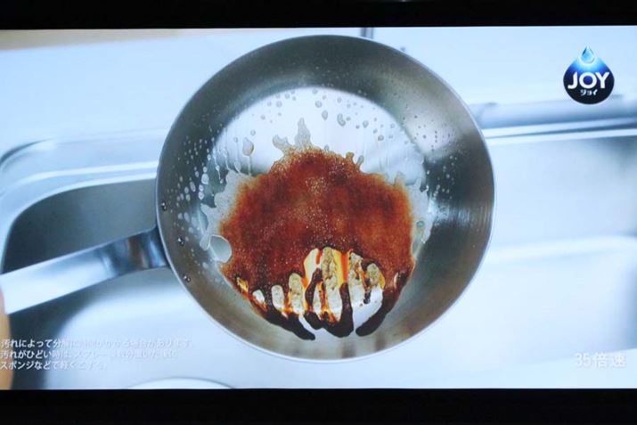 5分ほど置いてから水で洗い流すだけ。このサンプルはお皿が冷えすぎてしまっていたそうで、イマイチ汚れ落ちがよくないですが……