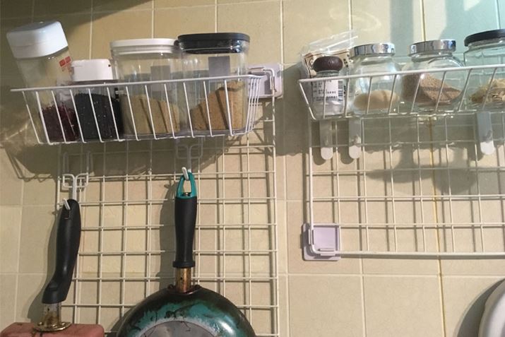 こういったメッシュパネルと専用のかごなどは100円均一にもありますが、通販でも探せます。キッチンに合う大きさや色を選んでみてください。