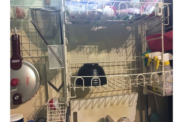 また、水切りカゴも毎日使うものなので、なるべく場所をとらないようにシンクの上部分に突っ張り棒タイプのものを置いて、空いている空間を利用しています! さらにワイヤーかごを横に取り付けて、洗ったカトラリー類や細かいものも置けるようにもしています。