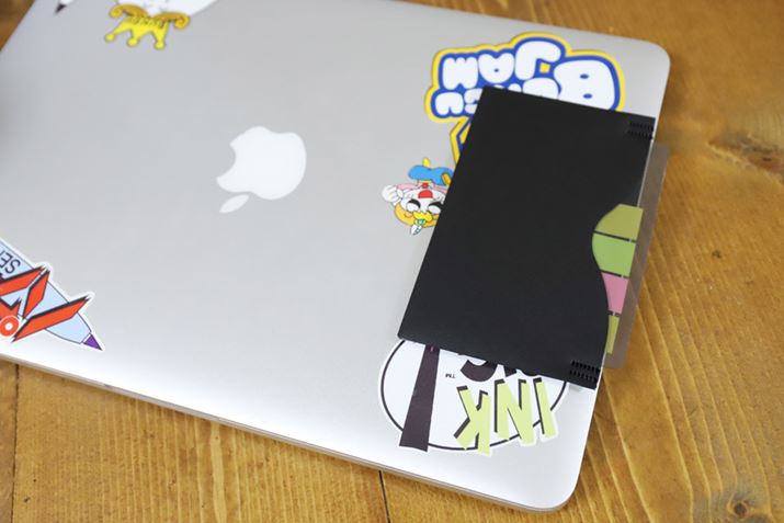 ノートPCの表面にボードを内蔵したカバーを貼り付けることで、メモ書き付箋が貼っておけるツール。ボードはスライド式で出し入れが自在なので、カバーに収納すれば付箋がはがれ落ちる心配もない。