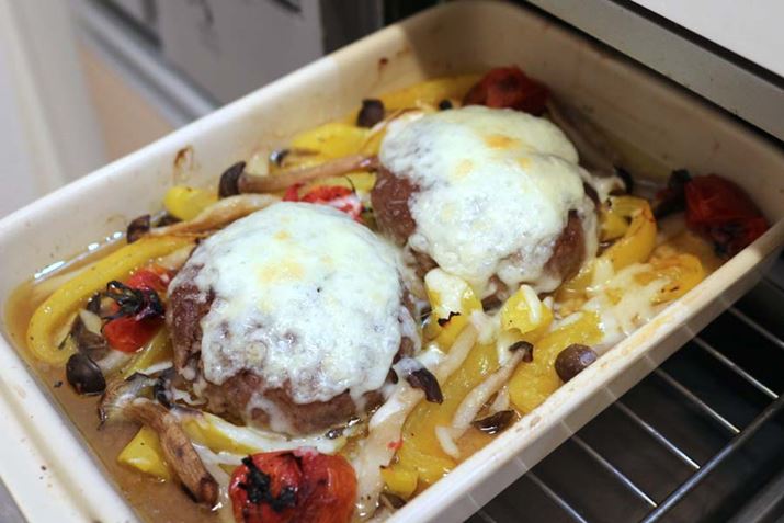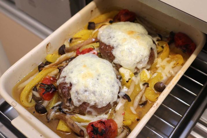 そこで、ハンバーグの切り口を覆うようにとろけるチーズをのせ、グリラーのふたをせずにグリルにイン。溶けたチーズのおかげで、ハンバーグの割れ目も気になりません。さまざまな加熱方法に対応するというグリラーの特性を生かした、我ながら完璧すぎる着地