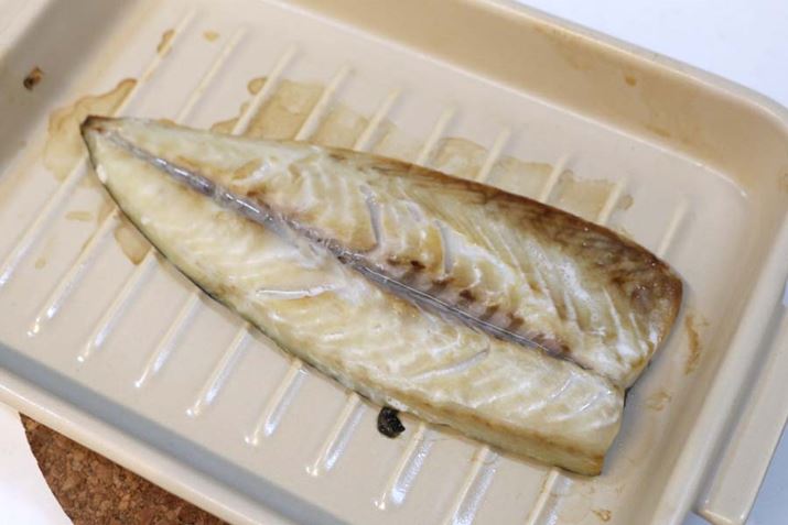 サバの切り身がちょうどよく入るサイズなので、焼き魚にも無理なく使えます。サバの場合、切り身を2枚並べて置くこともできました