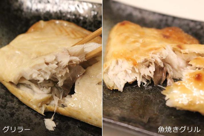 左がグリラーで焼いたサバ、右が魚焼きグリルで焼いたサバ。グリラーで焼いたサバのほうが身がやわらかく、しっとりして脂のジューシーさもたっぷり残っていました。しっかり焦げ目を付けたいという人は、魚焼きグリルで焼いたほうが好みに合うかもしれません