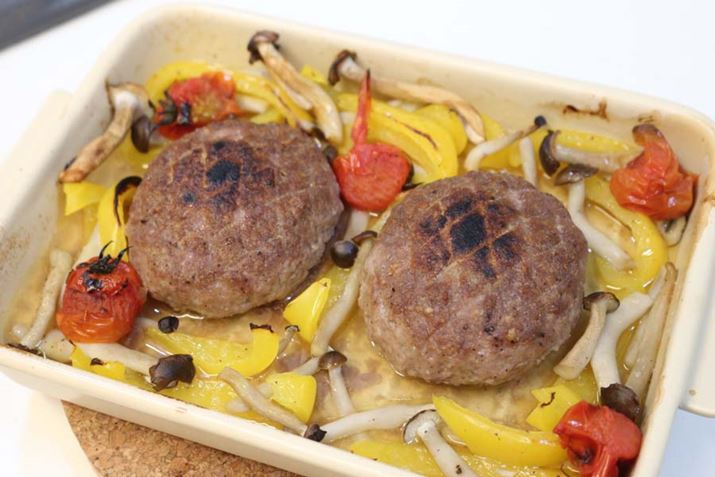 続いて、ハンバーグを作ってみました。付け合わせの野菜も一緒に入れて、蒸し焼き野菜に。15分加熱したあと、余熱で5分火を通します。