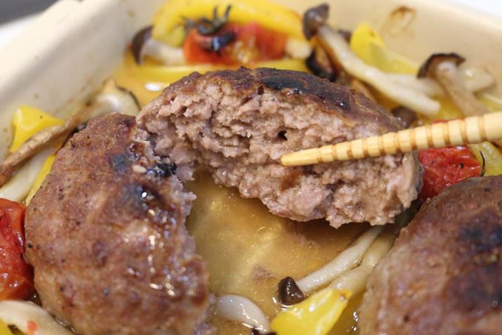 ハンバーグを割ってみたところ、まだ中、特に下のほうがだいぶ赤い。やはり片面焼きグリルの場合、直接熱の届かない下の部分は火が通りにくいようです