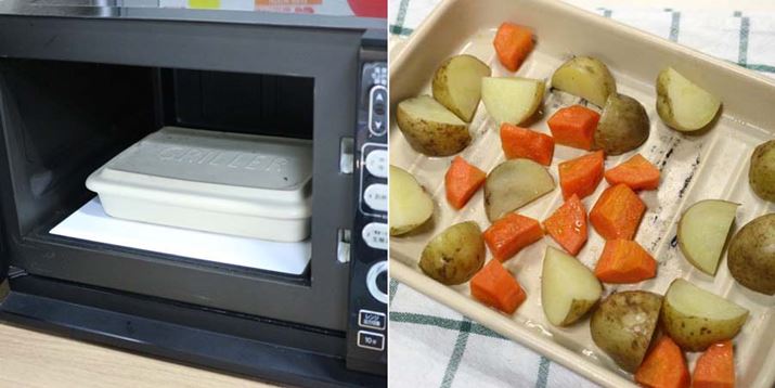 ごま油をからめたじゃがいもとにんじんをレンジで4分加熱。写真では庫内フラットのレンジを使用していますが、ターンテーブル式のレンジ(庫内幅30p)でも、回転時に庫内で引っかかることなく使用できました