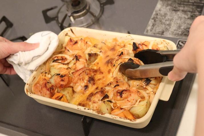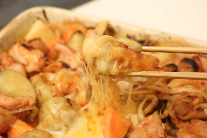 肉と野菜にしっかり火が通りつつ、チーズは加熱すぎずトロトロ! という絶妙な状態に仕上げたいチーズダッカルビ。じゃがいもやにんじんなど、火が通りにくい野菜を先に電子レンジで加熱しておけるのが、グリラーならではです。