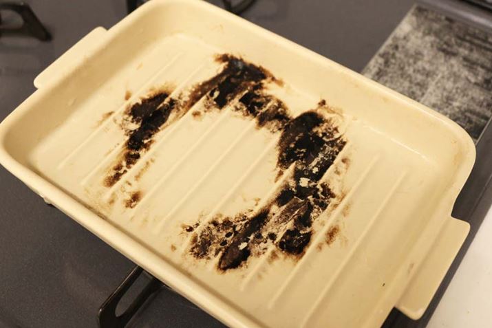 本体の汚れが1番ひどかった時がコレ。ワンタンを焼こうとしたところ、皮が焦げ付いてしまいました(鉄鍋餃子みたいにできるかなと思ったのですが、できませんでした)。肉や魚を焼いているだけでは、このような汚れにはならないと思います