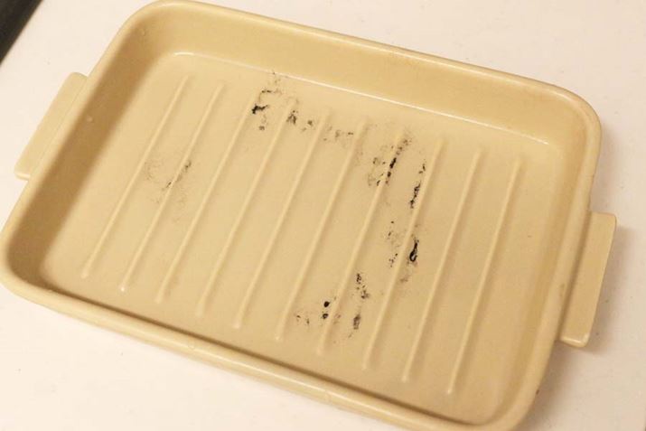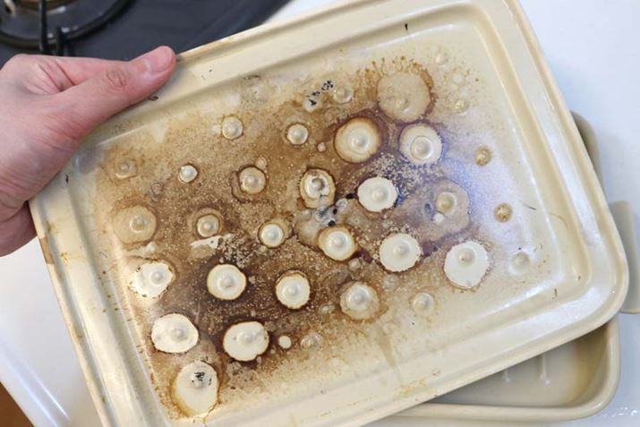 さて、さまざまな調理に使用したグリラー(ベージュ)ですが、どのくらい汚れているでしょうか。本記事で紹介しているレシピ以外の調理もしており、使用回数は10回ほどですが、特にふたの裏側の汚れが激しい。ベージュは前評判通り汚れやすいので、これから購入する方には、ブラックかブラウンをおすすめしたいです。グリラーは陶器なので、土鍋の焦げを取る時と同じ方法で汚れを落としてみました。