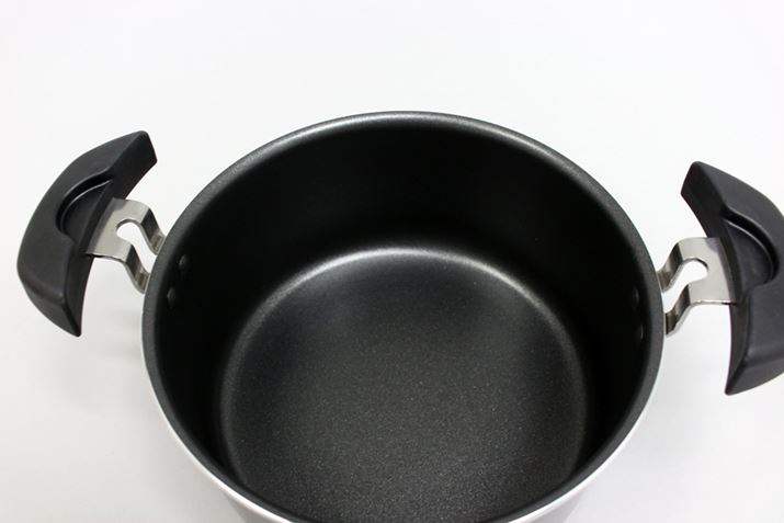 調理鍋の内側には3層のフッ素コーティングを施し、焦げ付きを低減。底面は熱が伝わりやすいように2.9mmの厚底設計となっています。鍋の重量(フタ含まず)は766gなので、食材を入れてもそれほど持ち運びには苦労しないでしょう