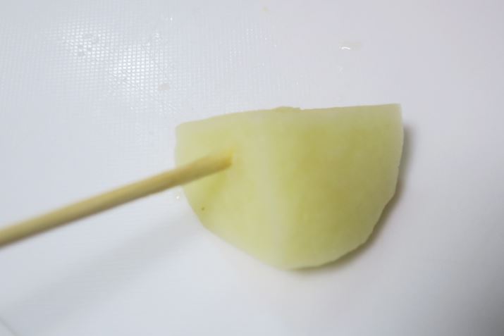 ついでに、5分加熱しただけの食材の火のとおりも確認してみたところ、じゃがいもの場合、串が半分刺さる程度でした