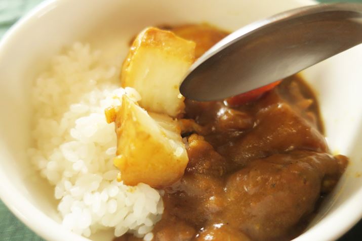 保温調理前は芯があった野菜も、スプーンで簡単に割れちゃうほどやわらか! お肉も硬くなっておらず、弾力もジューシーさも申し分ありません
