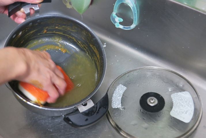 火に長時間かけていないので調理鍋に焦げ付きはなく、スポンジで軽く洗うだけで汚れがスッと落ちました。これは、ラク!