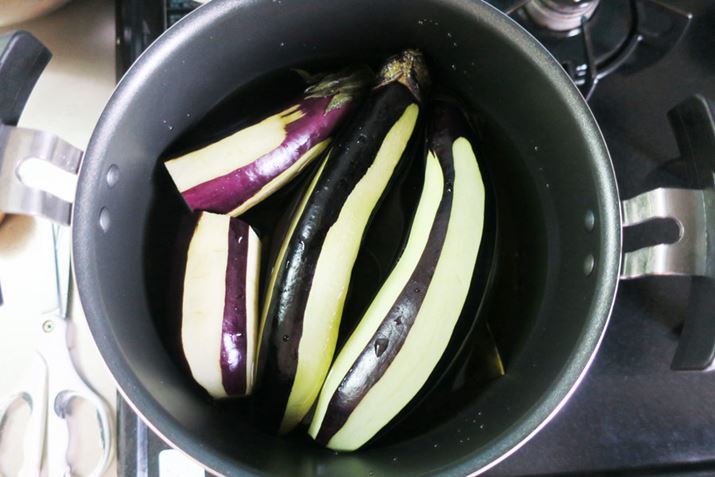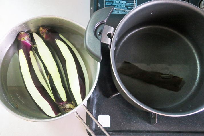 下ごしらえは、調理鍋に水と昆布を入れて15分置いておくのと、なすの皮をピーラーで縞模様に剥き、10分くらい水にさらすという程度で、思っていたよりめんどうじゃない!