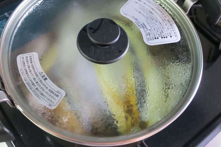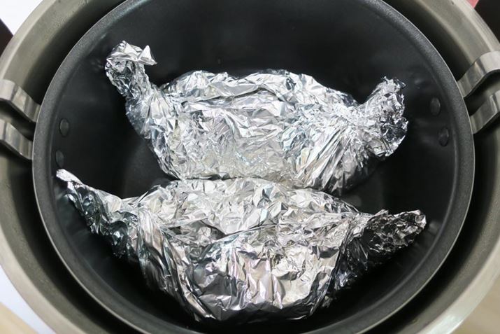 調理鍋に食材を包んだアルミホイルをセット。食材を多めに入れたので、2人分しか入りませんでした(筆者宅はまだ小さな子どもと旦那だけなので、これで問題なし)。この状態の調理鍋に水を入れ、フタをして加熱。沸騰したら中火にして6分加熱します