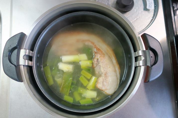 調理鍋に水を入れて加熱(沸騰後、弱火で10分間)したあと、コンロから下ろし、保温容器にセット。保温調理に移る前に、長ねぎやしょうがを入れておきます。そして、保温容器にフタをして1時間放置
