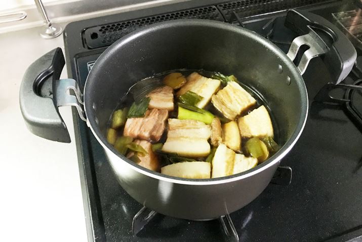 これまで作ったメニューなら、ここで完成ですが、豚の角煮は肉をカットして調理鍋に入れ加熱する工程があります。加熱時間は、沸騰させてからフタをして弱火で10分