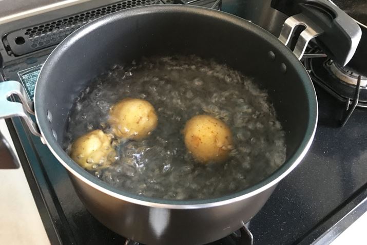 小さめのじゃがいもを丸ごと茹でる場合、普通の鍋なら20分くらい加熱しなければなりませんが、シャトルシェフは5分ほどの加熱と10分の保温調理でOK