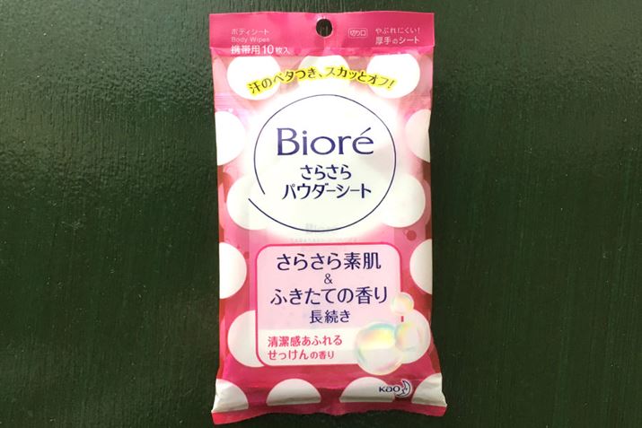 汗拭きシートといえばコレ、というぐらいよく見かける「ビオレ さらさらパウダーシート」。「透明さらさらパウダー」が配合されていて、肌のさらさら感が長続きするとのこと。シート自体は結構小さめですが、薄手の4枚が重なって1枚になっており、分厚いのが特徴的。ただシートが弱いのか、引っ張り出した瞬間に一部が破れてしまうことが多いです。
