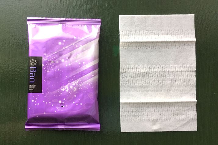 汗やニオイを吸着してベタつきを抑えてくれる「ナノイオン吸着パウダー」というものを配合したBanの汗拭きシート。今回のシートの中で大きさ自体は一番小さいのですが、3層構造になっており、一番分厚く頑丈でした! 力を入れて体を拭いてもシートがよれないので、小さくても問題なしですね。ただ、大きいシートのように何度か折り返して常に新しい面で拭く、ということはできません。