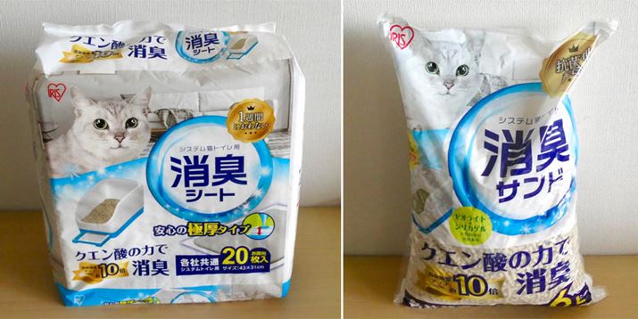 今回使ったのは、同メーカーの「システム猫トイレ用消臭シート」と「システム猫トイレ用消臭サンド」。クエン酸の力で消臭効果約10倍というペットシーツ&猫砂です