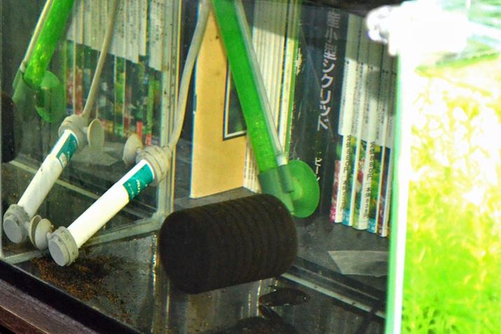昔ながらのスポンジフィルターと、サーモスタット一体型のヒーター。このような雑な設置でも筆者は気になりませんが、オシャレなアクアリウムとはほど遠い世界です