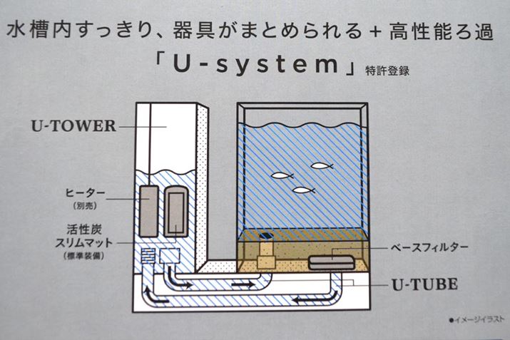 オーバーフロー方式を採用する「システム水槽」と呼ばれるジャンルの新世代水槽は、アクアメーカー各社からさまざまな製品が発売されていますが、今回試してみたのは、アクアリウム器具の老舗メーカー、ジェックスの「AQUA-U」。その名のとおり「U」の字型に水槽とろ過槽を配置することで、超小型のオーバーフロー方式水槽とした画期的な水槽です。