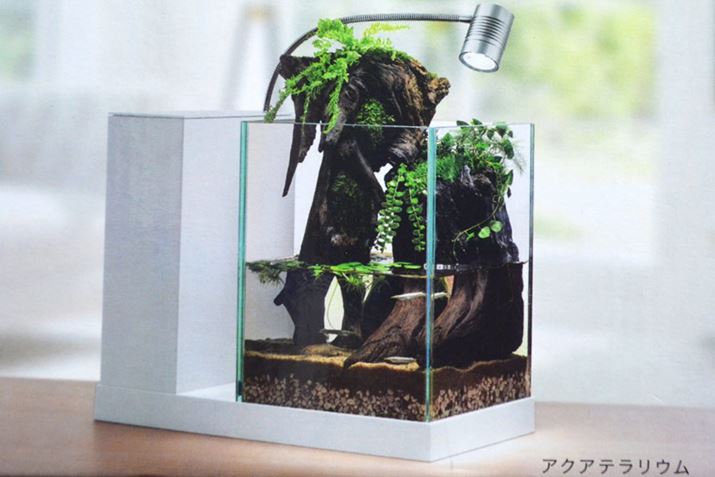 水槽本体は幅18cm、高さ26cmほどの極小サイズながら、ろ過槽分により水量は9リットルを確保。水や底床の量にもよりますが、セット時の総重量は12〜13kgほど。センスと工夫次第で、さまざまな動植物の育成が楽しめます