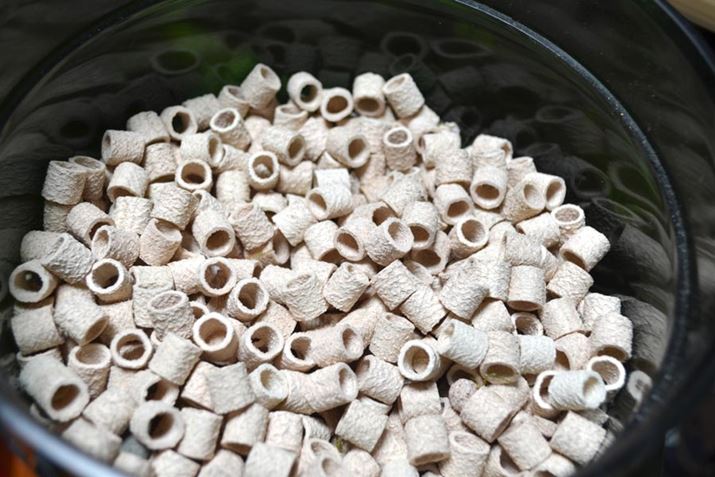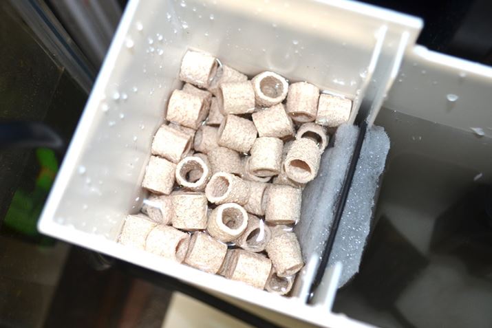 ろ過槽タワー内部(U-TOWERと呼ばれる部分)には、仕切り板に活性炭フィルター(活性炭スリムマット)が付いていますが、これはろ過機能としては気休めでしかないので、ろ過槽タワー内部(U-には必ず何らかのろ材(※)を入れましょう。製品の箱にはジェックス社の「ベストロカバイオリング」が推奨されているので、手持ちのろ過材の中からよく似たタイプの「エーハイム メック」というセラミック製のリング状ろ過材を入れました。すでに、ほかの水槽で数か月以上使用しているフィルター内部のろ過材を入れると、新規で立ち上げた水槽でも安定するのが早くなります。すべて新規で水槽を立ち上げる場合は、ろ過バクテリアのタネ系のケミカルを使用するとよいでしょう。