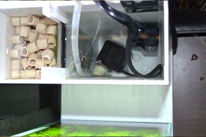 ろ過槽タワー内部に、ヒーターと二酸化炭素添加レギュレーターを収めた様子。もちろん普段はフタをしていますが、内部が崩れたりしないか時々チェックしています